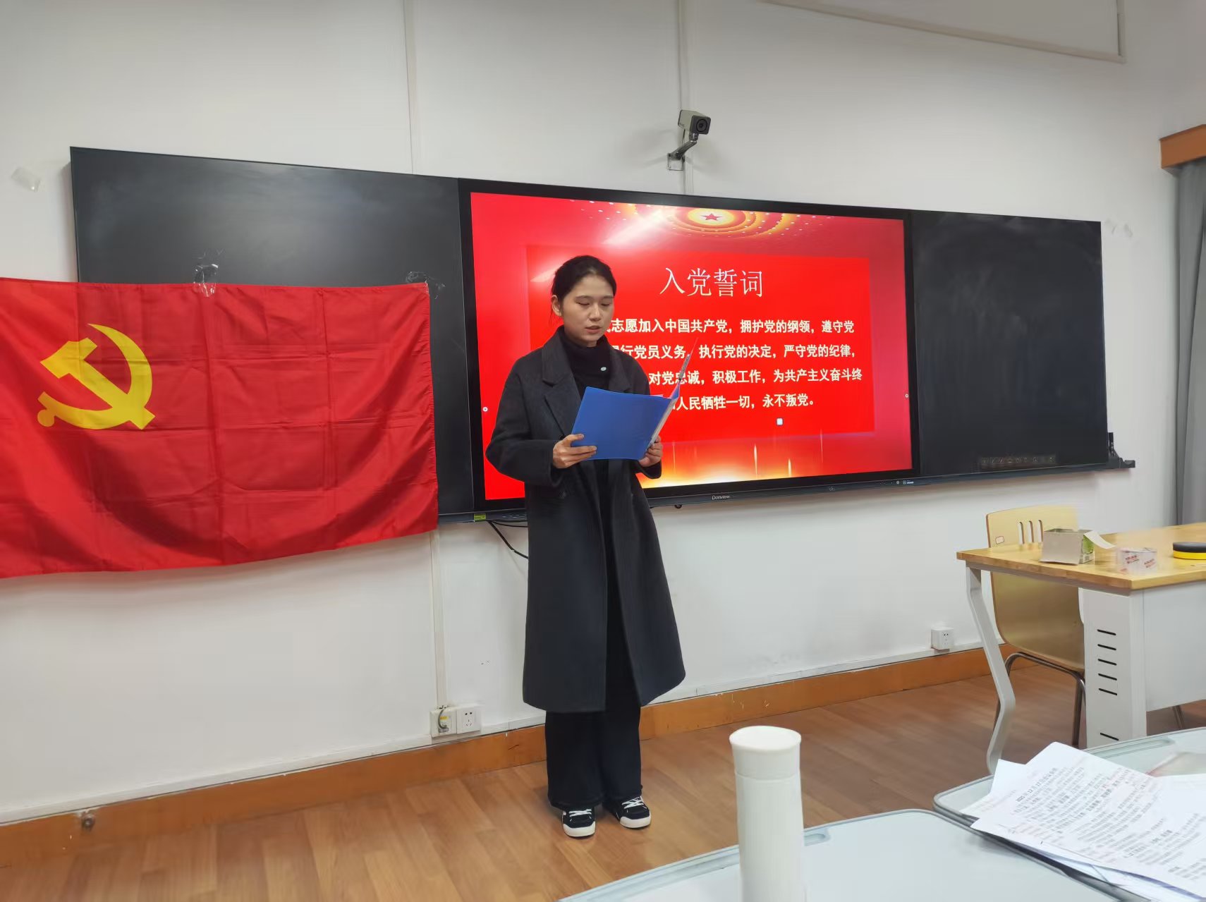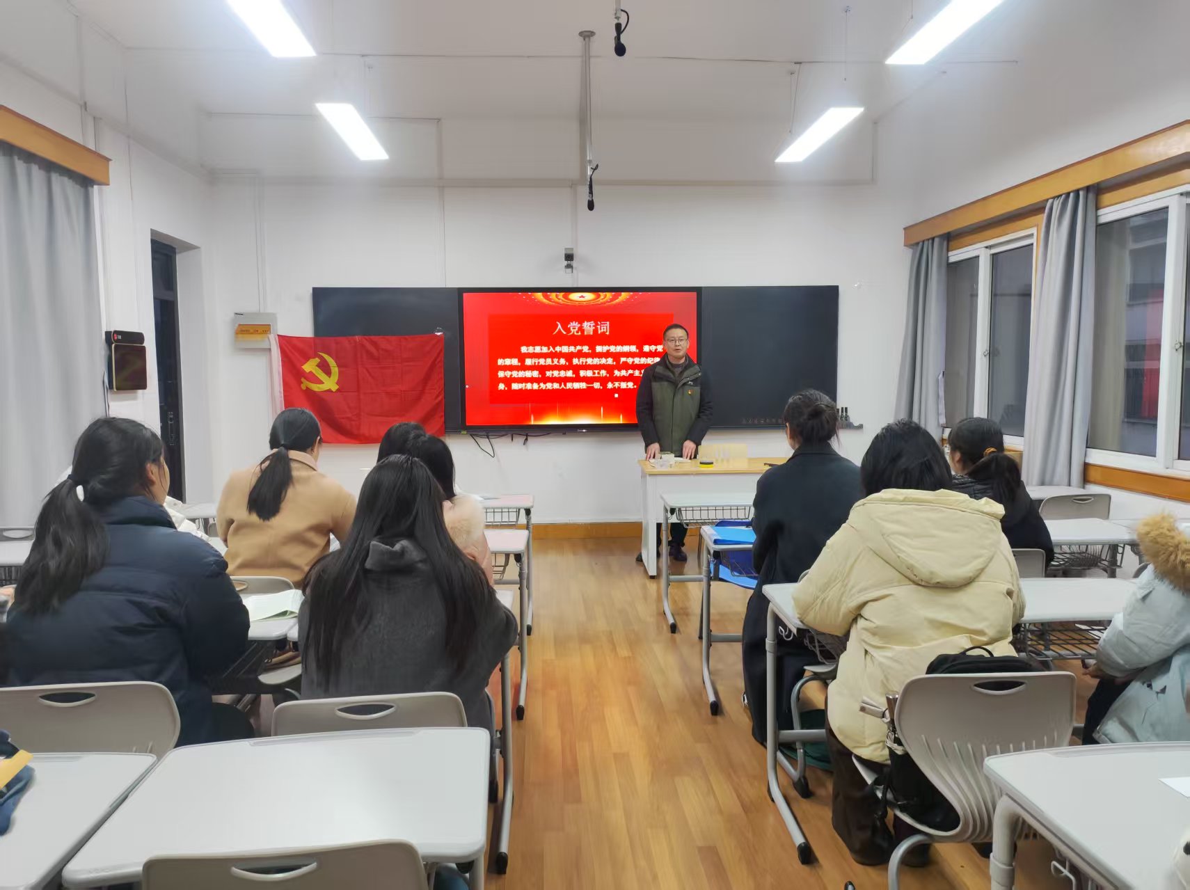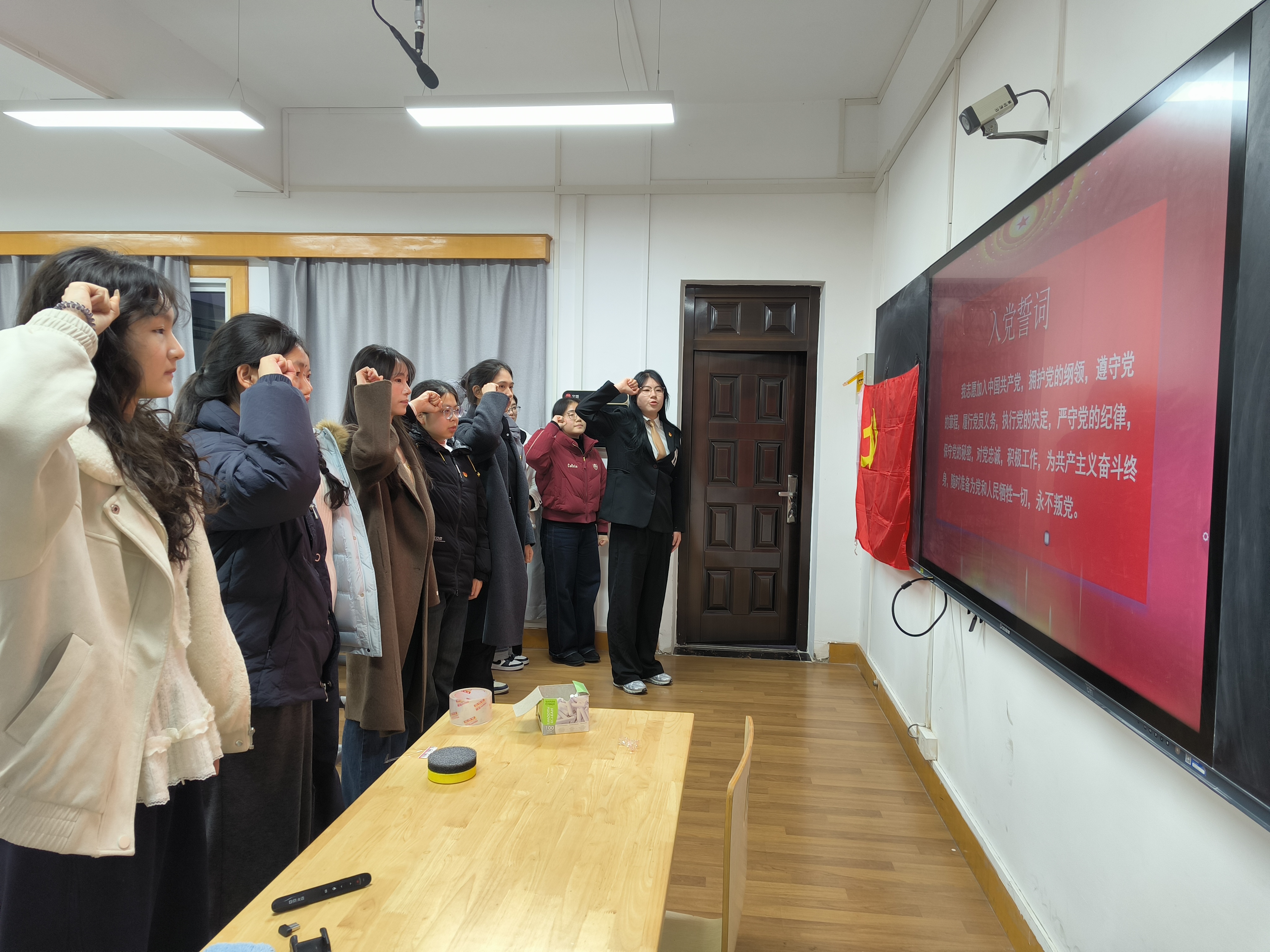 在领誓人彭秦雅格同志的带领下,预备党员们身着正装,高举右拳,面对鲜红的党旗逐句庄严宣读入党誓词。铿锵有力的誓言回荡在教室,既表达了对党的无限忠诚与热爱,也彰显了为共产主义事业奋斗终身的坚定决心,让在场全体党员接受了一次深刻的党性洗礼。
